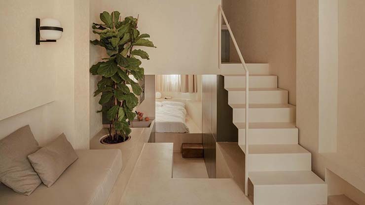 Arhitektica Ana Hernández iz studija Her Arquitectura osmislila je enterijer u kojem vlada osjećaj topline i odmora. Visoki prozori, prirodni materijali, svijetle nijanse i mikrocementni podovi stvaraju prozračan i savremen ambijent. Spavaći prostor smješten je u svojevrsno "gnijezdo" s duplom visinom, dok su kupatilo i kuhinja maksimalno funkcionalne unatoč skromnoj kvadraturi.